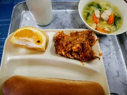 とうふのミートグラタン スープ煮 はっさく レーズンパン 牛乳