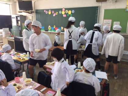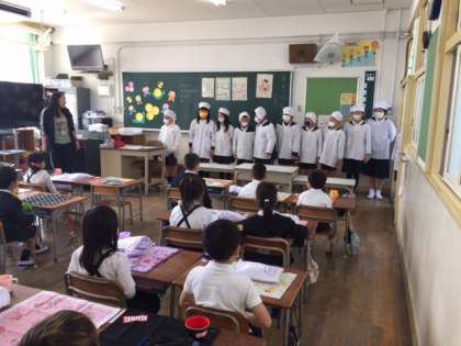 1年生の配膳は6年生がお手伝いをしました。てきぱきと行動し、優しく1年生に声をかける姿はとても素敵でした。