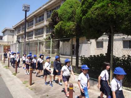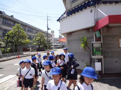 4つのグループに分かれて、公園や施設、お店などがどこにあるのかを確認しながら校区のようすを学習しました。