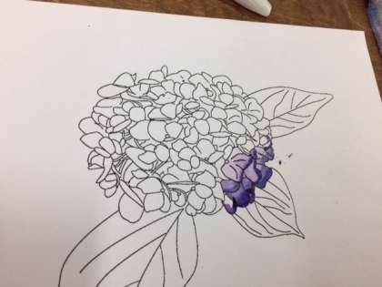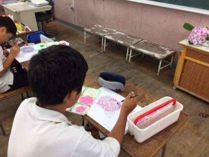 図画工作科では、グラデーションの学習で学んだことをいかして、紫陽花の色付けに取り組んでいます。