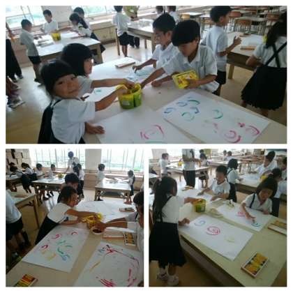 指を使って画用紙に描いています。