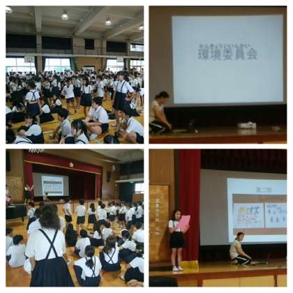 環境委員会の発表では、〇×クイズをしながら環境委員会の役割やみんなに協力してほしいことについて呼びかけていました。