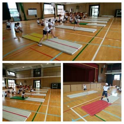 6年生のマット運動では、開脚前転・好転の技に取り組んでいました。