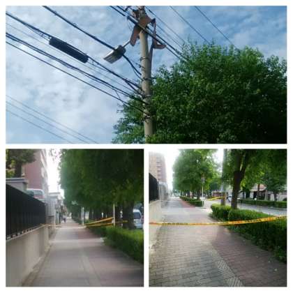 南門(運動場側)歩道の電線にものが引っかかったままの状態であり、歩道が通行止めとなっております。