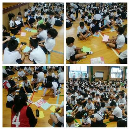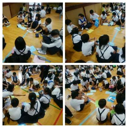 今日の児童集会は、子ども祭りでいっしょにお店を回るペア学年との顔合わせでした。