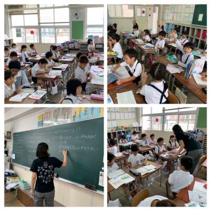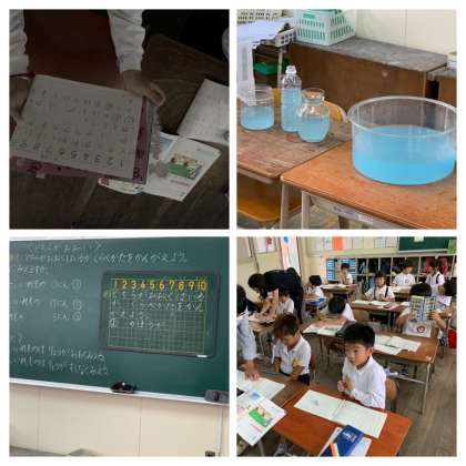 形が異なる容器のどちらに多く水が入るか比べ方を考える場面です。