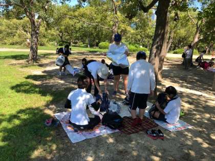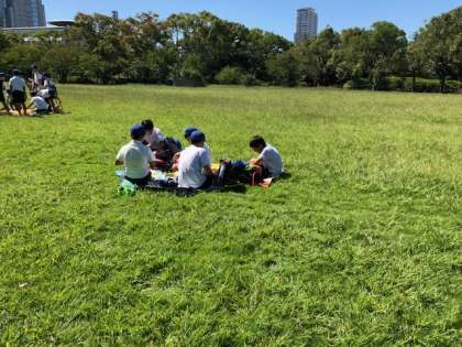 大阪城の前で写真撮影をしてから、西の丸庭園の広い芝生で昼食を食べています。