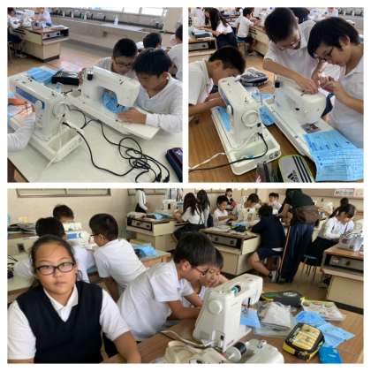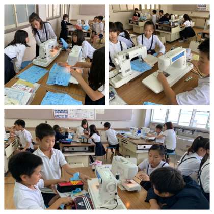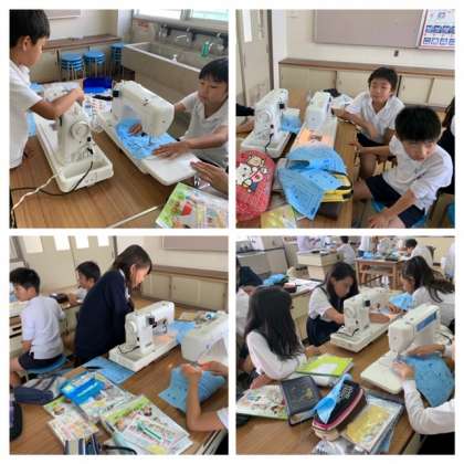 5年生の家庭科では、ミシンを使う練習をしていました。
