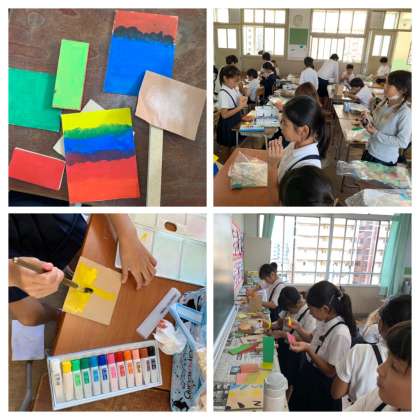 4年の図画工作では、板をのこぎりで切った後、パーツごとに色をつけていました。