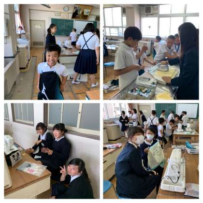 6年の家庭科では、ミシンを使い、エプロンづくりをすることができました。