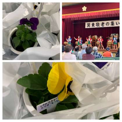 子どもたちが書いてくれたメッセージプレートといっしょに花がプレゼントされていました。