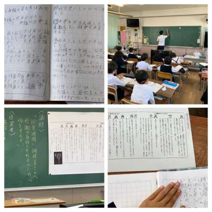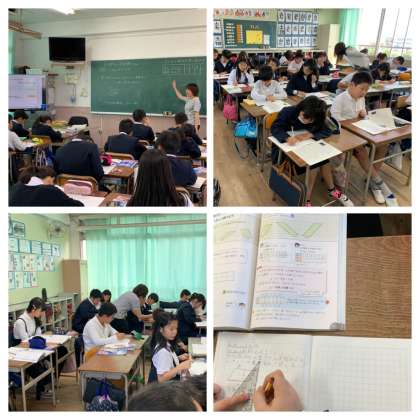 6年生は算数「比例と反比例」について、4年生は国語「クラスの話し合い」についてノートに書きながら進めています。