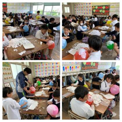2年生は図画工作で風船に紙を貼って作品を作っていました。