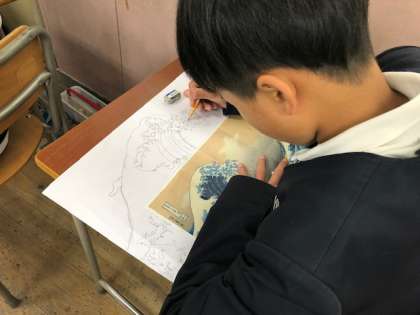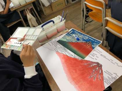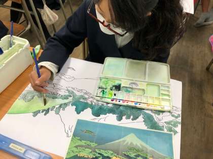 6年生の図画工作科の授業では、社会の歴史の学習で学んだ、浮世絵にチャレンジしています。色つけでは、水の量や混色の仕方を工夫し、表現豊かに描いています。