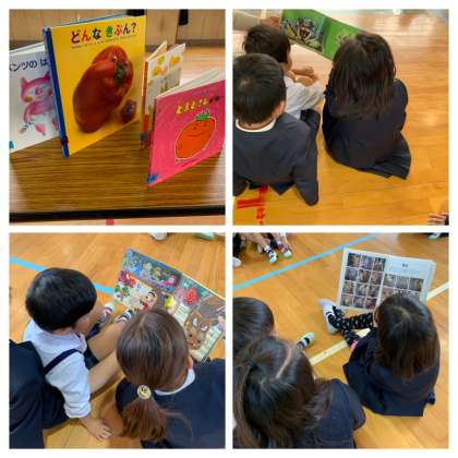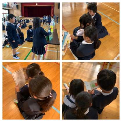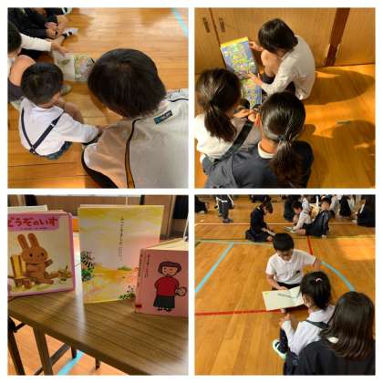 新1年生が小学校の環境に少しずつなれるようにと、4年生が絵本を読んでいます。