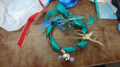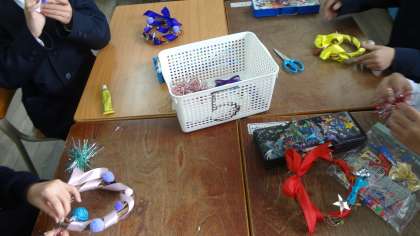 モールやリボンを巻きつけて、きれいに仕上げています。