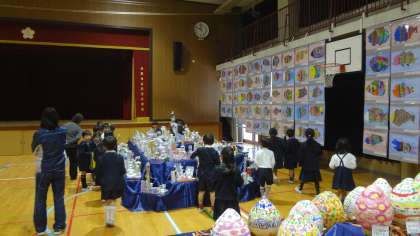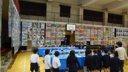 1年生が作品展の鑑賞をしています。