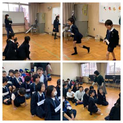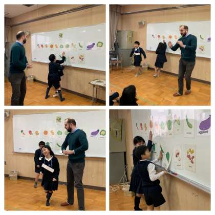 スープに入れる野菜を英語で質問して、答えのカードを見つけるゲームをしていました。