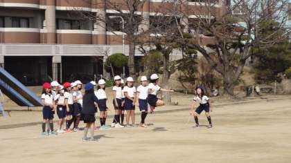 何をするかをしっかり聞いた後、グループに分かれて長なわに取り組んでいます。