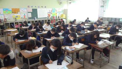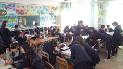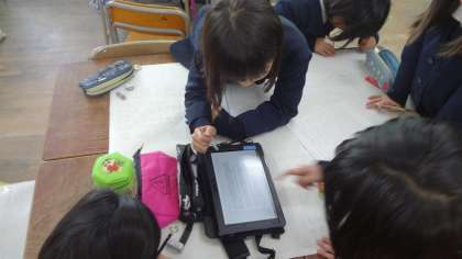 グループごとにテーマを決めて、調べたことをまとめています。調べるのにタブレットを活用しています。