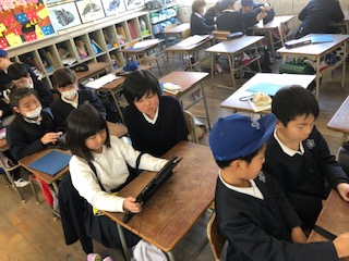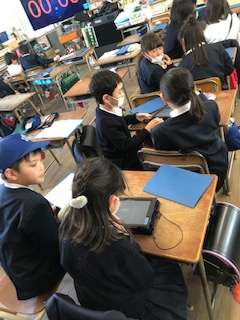 2人1組になって、タブレットのタイマー機能を使い、作文の発表練習をしています。発表時間の1分に合わせるのに苦戦しています…。