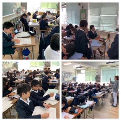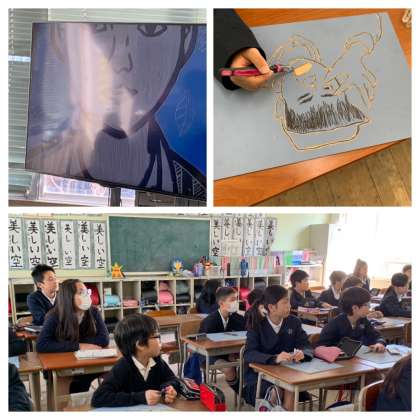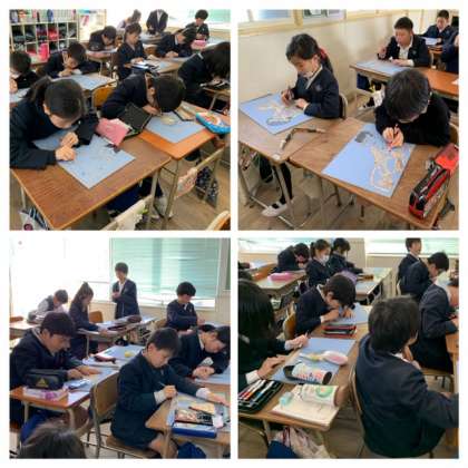 5年生では版画のお手本VTRを見て学習した後、彫刻刀で彫り進めていました。