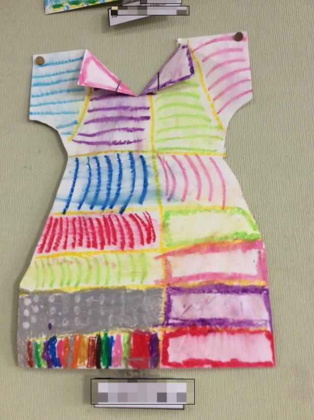 色カラフルな色彩とクレパスを使った塗りの技法を駆使して、たくさんの洋服が並びました。