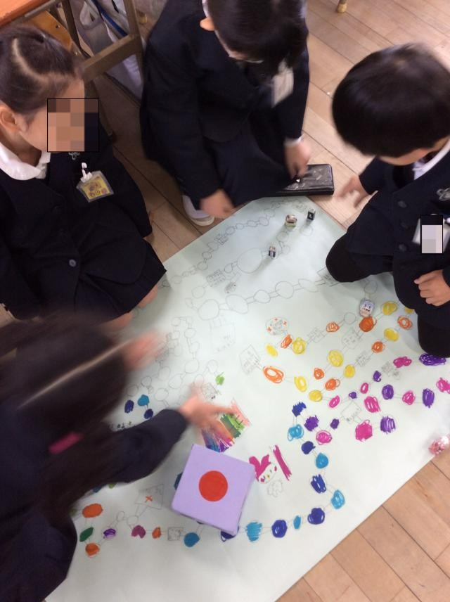 すごろくゲームをしているとの話を聞いて早速見に行くと、算数科でさいころの学習をし、その続きですごろくゲームを班で作って楽しんだそうです。