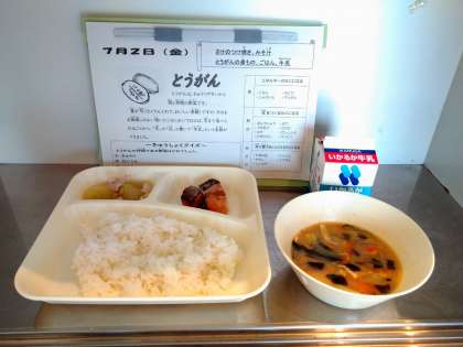 7/2(金)の献立は、さけのつけ焼き、みそ汁、とうがんの煮もの、ごはん、牛乳でした。