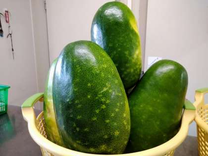 冬瓜の出回り期は、6月から9月頃までですが、貯蔵性が高く、冬を越えて貯蔵ができるので、中国で「冬かぼちゃ(冬瓜)」と呼ばれ、日本でも冬瓜と呼ばれています。本日は、煮ものとして登場しました。鶏肉も入り、だしの風味がしっかりと出ており1年生にもとても好評でした。