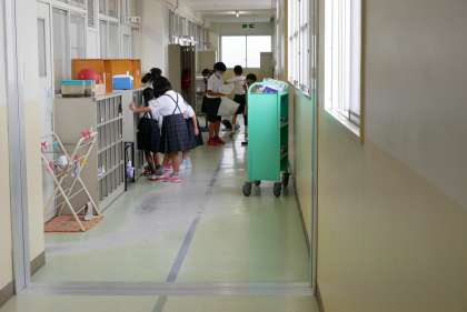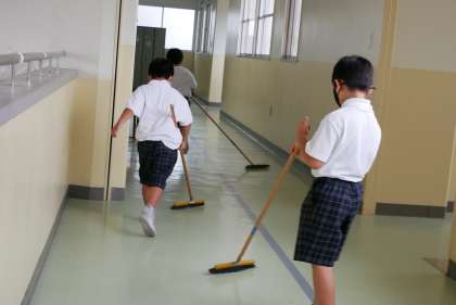 低学年の子どもたちの掃除の時間の様子です。子どもの「なんでも遊びに変える力」は、掃除にも発揮されているようで、ある時はみんなと協力して、ある時はごみをたくさん集める競争のように掃除に取り組んでいました。