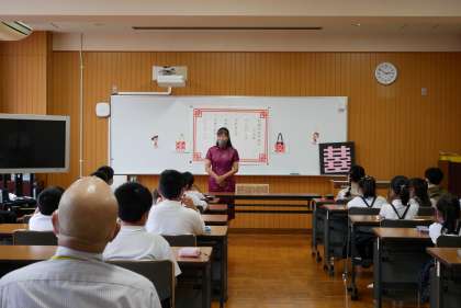12日、熊猫班級(中国学級:ションマオパンジー)の開級式が行われました。最初に教頭先生がはじめの言葉を述べ、校長先生の式辞の後、学級の代表児童のあいさつが行われました。