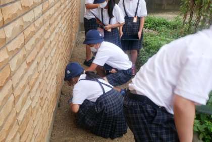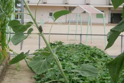 4年生が理科の「夏の生き物」の学習で、学校の中にいる生き物をさがして、タブレット端末を片手に校庭をさがしまわっていました。雑草園のそばで見つけたアリ、ダンゴムシ。学習園のひまわりの上にくっついていたセミ。校舎の壁では小さなカメムシを見つけていました。