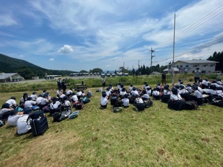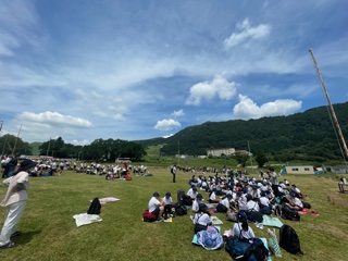 5年林間学習3 公開日 2021/07/23 更新日 2021/07/23 お知らせ ハチ高原到着しました ほぼ予定通りの時刻に、到着しました。 子どもたちは、車に酔う子どももほとんどなく、皆元気です。 開舎式を行い、宿舎の方々に挨拶をしました。現地での「5分前行動」や「予定を考えて行動する」ことを確認しました。 開舎式の後、グループごとにおにぎり弁当を食べました。 いいね(0)