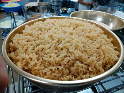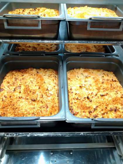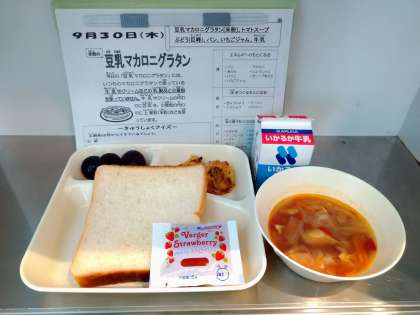 本日のマカロニグラタンは、乳、小麦アレルギーのある児童も食べることのできる献立となっています。牛乳やクリームの代わりに豆乳、小麦粉の代わりに上新粉(米粉)を使用しています。さらに、小麦の加工食品であるマカロニを使わず、米粉のマカロニを使い、上からふりかけるパン粉も米粉で作ったパン粉を使用しています。仕上がりが良く児童にも大人気でした。