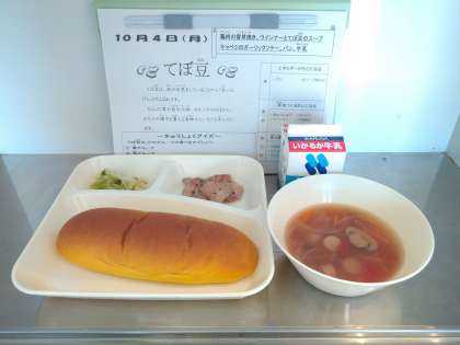 大阪市の給食には様々な豆が登場します。本日のスープに使われている「てぼ豆」は、種皮が白色をしていることから、大福豆などとともに「白いんげん」とも呼ばれています。てぼ豆は、炭水化物やたんぱく質、鉄、じょうぶな骨や歯のもとになるカルシウムなどの栄養素を含みます。また、体内でエネルギーや物質の代謝に必要なビタミンB1、ビタミンB2、腸の調子を整える食物繊維も含んでいます。