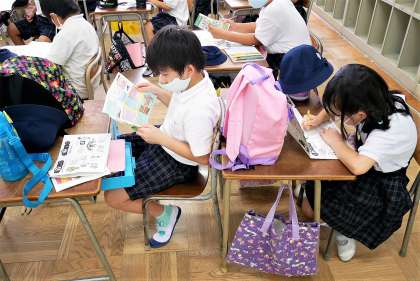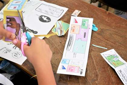 二年生が遠足から戻って、教室でしおりとパンフレットを使って、一日の振り返りを行いました。