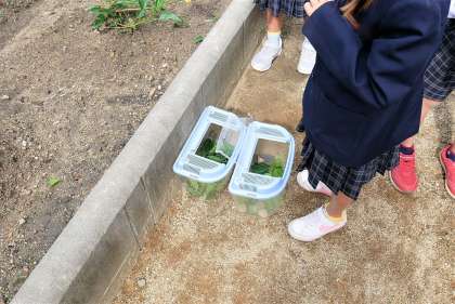 虫が喜ぶようにと、虫かごに草なども集めています。