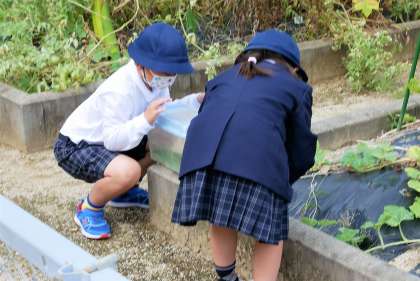 秋の虫をさがして、学習園と雑草園でバッタさがしをしています。