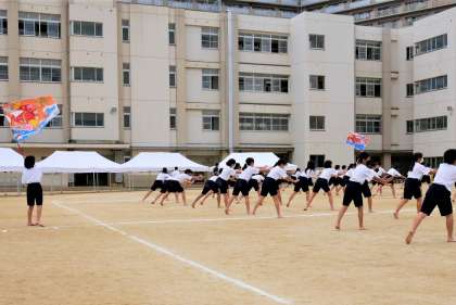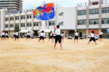 各学級ごとの思いをのせた旗が、大漁旗のように風に乗ってはためきます。