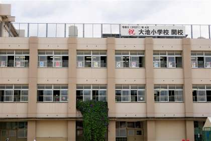 朝礼台に向かい合って立つと、校舎の三階窓の部分に、第一回の運動会の目標である、『勝利を目指して大池っ子!』の文字を確認できます。