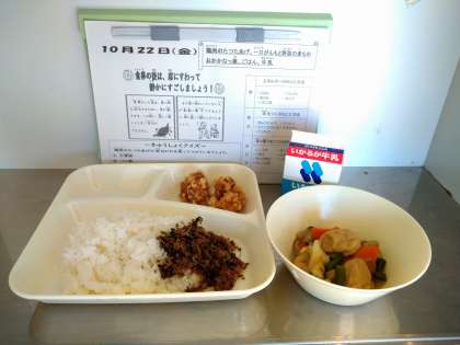 10/22(金)の献立 公開日 2021/10/22 更新日 2021/10/22 お知らせ 10/22(金)の献立は、 〇 鶏肉のたつたあげ 〇 一口がんもと野菜の煮もの 〇 おかかなっ葉 〇 米飯 〇 牛乳 でした。 本日は大人気献立、鶏肉のたつたあげでした。だしのきいた一口がんもと野菜の煮もの、ごはんによく合うだいこん葉とかつおぶしを使ったおかかなっ葉。どの学級もとても残食が少なくよく食べていました。 いいね(0)