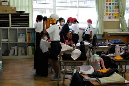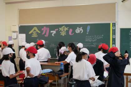 朝、学校に到着し、運動会の準備をしている教室の様子です。