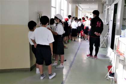 運動場に出る直前の廊下では、少し緊張した様子でしたが、子どもたちの雰囲気からは「やるぞ!」という気持ちが感じられました。