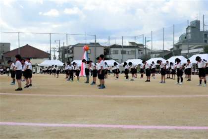 集団演技では、「BTS」の『Dynamite』『Butter』の曲にのって、軽快なステップの踊りをを見せてくれました。バンダナのワンポイントが隊形移動によって鮮やかに映え、子どもたちの踊りをよりかっこよくしていました。