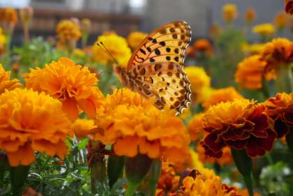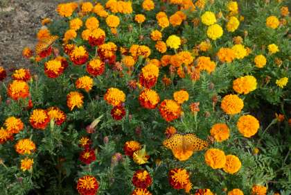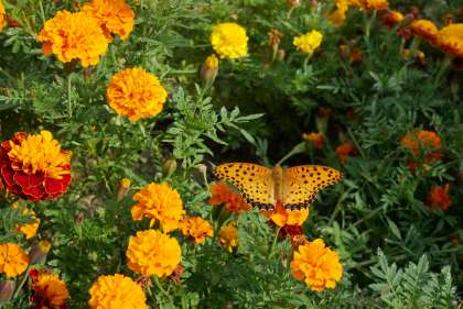 校庭の端の方には、『学習園』と『雑草園』があって、『雑草園』の色鮮やかに咲き誇るマリーゴールドに、だいだい色の蝶々がやってきていました。