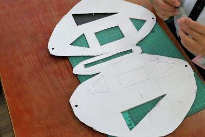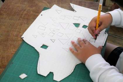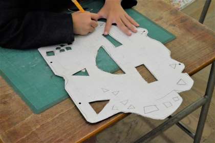台紙から三角形や四角形をカッターナイフで切り抜き、切り抜いた部分の裏からセロハンをはりつけて作品づくりをします。