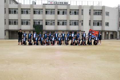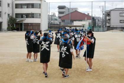 団体演技の衣装「はちまき」と「はっぴ」を身に着けて、学級の旗をかかげ、運動会の思い出を写真に収めました。