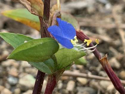 二枚の花弁が青い蝶のように開いた小さな花は、朝に咲いた花が、昼にはしぼんでしまうことから「朝露」を連想して、『ツユクサ(露草)』と呼ばれるようになったと言われています。