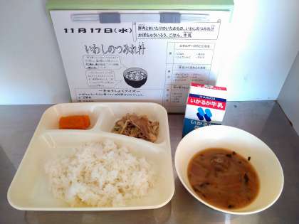 今日は手作りういろうが登場しました。かぼちゃのペースト、上新粉、砂糖、水を混ぜ合わせて蒸しています。人気のあるデザートで「かぼちゃは苦手だけど、かぼちゃういろうは大好き!」と言っている児童もいました。大池小学校では、まっ茶ういろうも人気があり、「まっ茶ういろうはいつ出るの?」と聞いてくる児童もいました。